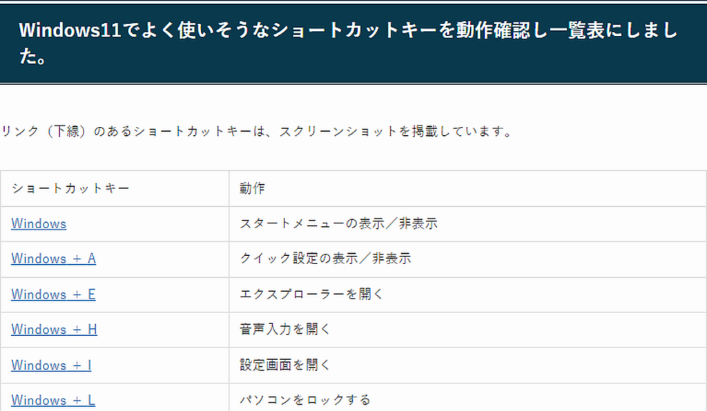 【Windows11でよく使うショートカットキーを動作確認し一覧表にしました。】 リンク(下線)のあるショートカットキーは、スクリーンショットを掲載しています。 Windows11ショートカットキー早見表 ショートカットキー動作Windowsスタートメニューの表示... -